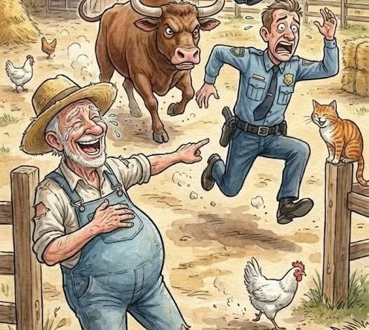 He cupped his hands and called out, voice carrying easily across the yard. “Next time,” he said, “you might want to show your badge to the bull first.”