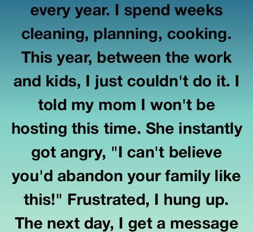 So, I called my mom. Calmly, I told her I couldn’t host this year. She didn’t hesitate. “I can’t believe you’d abandon your family like this!” she snapped. Her words stung, but not because they were new — because they weren’t. I’d spent years being treated like the family’s default event planner instead of a daughter. I hung up before I said something I’d regret.