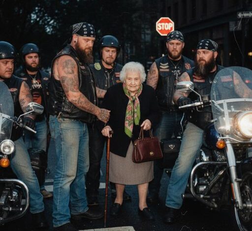 The first biker—beard guy—kills his engine. Doesn’t say a word. Just climbs off his Harley, walks up to her, and offers his arm like he’s escorting royalty. One of the others stops traffic with both hands out like Moses parting the sea.