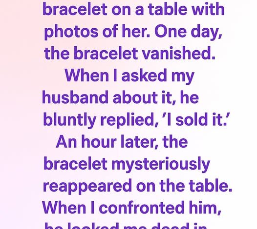 One morning, I noticed the bracelet was gone. My heart sank. I searched everywhere — under the table, in drawers, even inside the couch cushions — but it was nowhere to be found. Confused and upset, I asked my husband if he’d seen it. Without hesitation, he said, “I sold it,” and walked away. My chest tightened. I couldn’t believe he’d say something like that about something so precious. I felt hurt and betrayed.