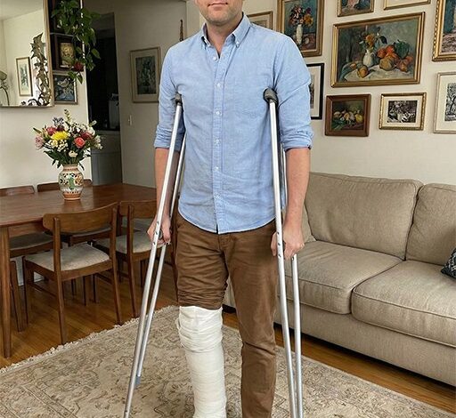 His right leg was wrapped in a thick white cast from just below the knee to his ankle. The crutches leaned awkwardly under his arms. He looked pale, rumpled, and exhausted.