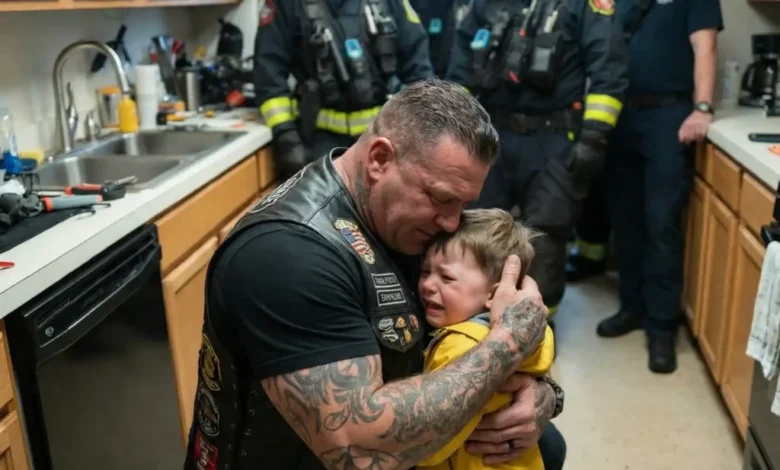 The firefighters called me to hold the boy who just killed his mother. I’m a 54-year-old biker with tattoos covering both arms and a leather vest I’ve worn for thirty years. I’m not a counselor. Not a social worker. Not family.