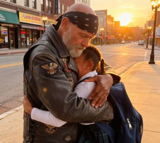 Every morning at 7 AM sharp, I roll my motorcycle to a stop a few houses down from the small blue home where eight-year-old Keisha lives with her grandmother. The engine barely cools before the front door swings open and she comes sprinting out, backpack bouncing, braids flying, yelling “Daddy Mike!” like I’m the best part of her day. Her grandmother stands behind her, one hand on the doorframe, watching with tired but grateful eyes. She knows exactly who I am—and who I’m not. I’m not Keisha’s biological father. I’m not a relative. I’m not a man who planned on having children at all. I’m just the biker who found a terrified little girl on the worst day of her life and refused to walk away afterward.