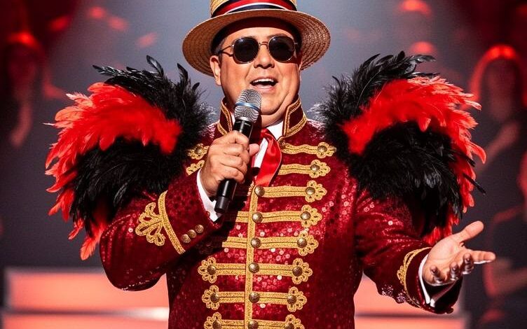 The performer stepped out dressed like a walking celebration: a sparkling red jacket, dramatic feathered shoulders, sunglasses, and a classic boater hat that instantly signaled this wasn’t going to be an ordinary vocal performance. Before a single note was even sung, the audience could already feel it — this was a tribute act built for the spotlight.