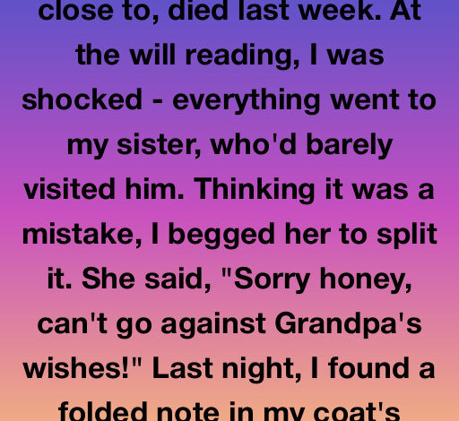 Grandpa died last week, and the world went a shade duller. At the will reading, my heart took another hit: everything went to my sister, Carina—the one who stopped by twice a year with store-bought cookies and a selfie. I thought there had to be a mistake. I pulled her aside, begged her to split it.
