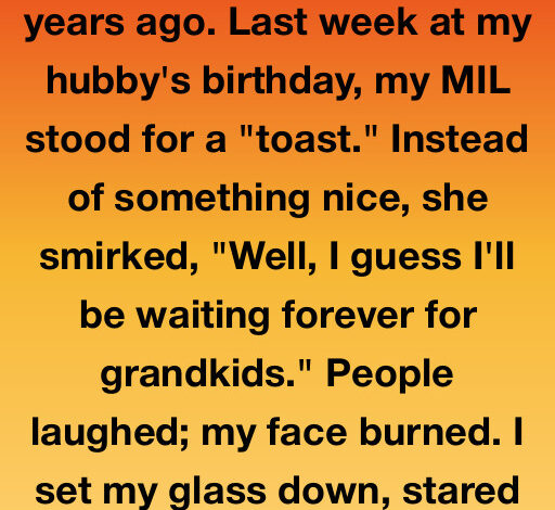 I married my husband seven years ago. Last week, at his birthday dinner, my mother-in-law stood up to make a “toast.” Instead of saying something kind, she lifted her glass, smirked, and said, “Well, I guess I’ll be waiting forever for grandkids.”