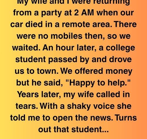 My wife and I were returning from a party at 2 AM when our car died in a remote area. There were no mobiles then, so we waited. An hour later, a college student passed by and drove us to town. We offered money but he said, “Happy to help.” Years later, my wife called in tears. With a shaky voice she told me to open the news. Turns out that student…
