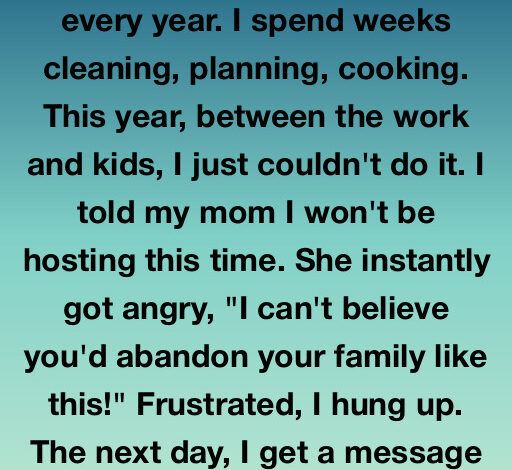 I host Christmas every year. I clean for weeks, plan menus, map out oven schedules, and wear a permanent dusting of flour by mid-December. This year, between my full-time job, the kids’ school chaos, and the house never staying clean for more than ten minutes, I hit a wall. I called my mom and said, as calmly as I could, that I wouldn’t be hosting.