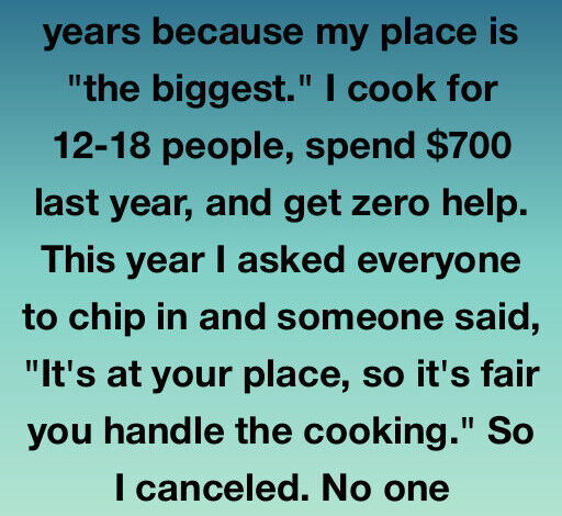 The moment something finally cracked wasn’t dramatic, but it was sharp enough to leave a lasting mark. Last Christmas, as I rushed between the oven and the counter, my cousin Silas lounged on the couch and commented that the stuffing wasn’t “moist enough,” delivering his critique without malice but also without awareness. Not a single person offered to help clear plates, wash dishes, or even refill a glass of water. By midnight, after everyone had left, I stood alone in the kitchen scrubbing a roasting pan that felt welded to my hands, staring at my reflection in the darkened window. I barely recognized myself. In that moment, the realization hit with uncomfortable clarity: I was no longer a host. I was an unpaid caterer who happened to own the building. That awareness lingered into the new year, growing stronger each time someone casually assumed I’d handle the next gathering. When the holidays rolled around again, I decided to try something different. I didn’t make demands or issue ultimatums. I simply asked, politely and clearly, that everyone chip in this year—either financially, through cooking, or by sharing the workload. The response came quickly and stung more than I expected: “It’s at your place, so it’s fair you handle the cooking.” That single sentence erased years of effort in one stroke. So I canceled. I said I wouldn’t host if the burden remained entirely mine. No one volunteered to take over. Instead, they organized a “Plan B” Christmas without me, and somehow, that hurt more than the money ever did.