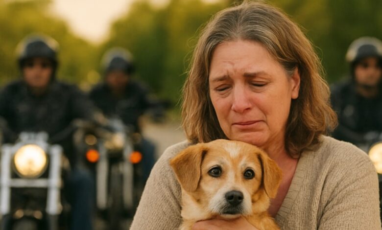 The bikers stopped right in front of her. For a few seconds, none of them spoke. They just looked — at her frightened face, and the little dog she was holding tightly.