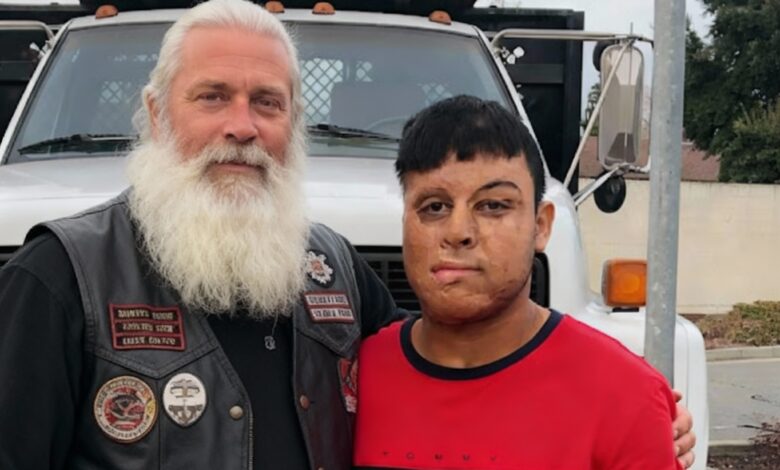 This biker gave my burned son his Purple Heart after nobody else would even look at him. I watched this stranger with a white beard and leather vest walk right up to my boy while everyone else turned away, and I knew something extraordinary was about to happen.