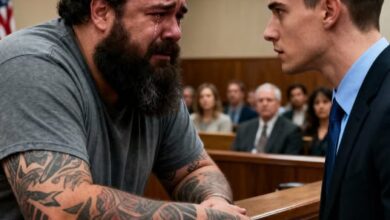 Big guy. Leather vest. Gray beard like steel wool. Tattoos creeping up his neck. He started showing up every Tuesday at exactly 9 AM, carrying a new shoebox. Not cheap shoes — good ones. Nice ones. Quality. He’d kneel down, offer them with a gentle voice that didn’t match his rough appearance… and every time, she turned him down.