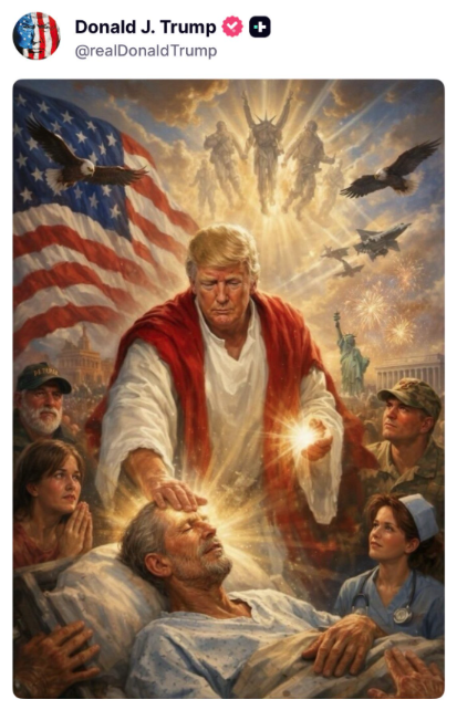 The illustration showed Trump dressed in flowing robes, placing a glowing hand on a man in a hospital bed, with surrounding figures appearing in reverence, an image many say closely mirrors traditional depictions of Jesus healing the sick.