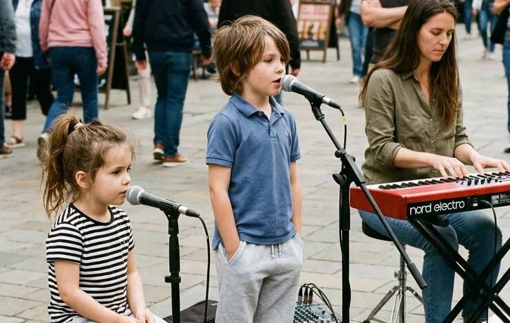 What looked like a small, casual street performance quickly became something far more memorable for those who happened to pass by. Set up along a busy pedestrian area, the scene didn’t immediately stand out — just a keyboard, two microphones, and two young children preparing to sing.