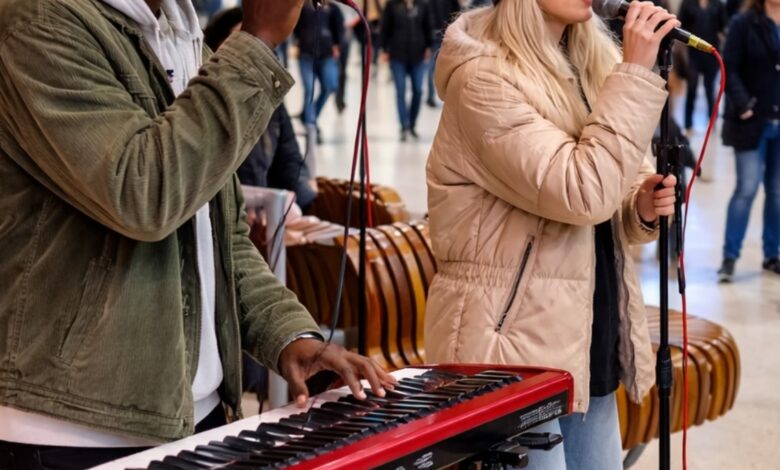 In a busy indoor station filled with constant movement and travelers rushing by, a young woman stepped up to a microphone as part of a simple street performance setup. With announcements echoing and noise all around, the environment was anything but quiet.
