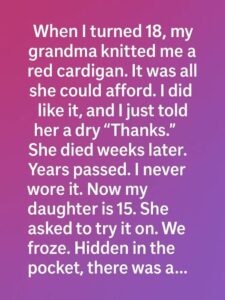 When I turned 18, my grandma gave me a red cardigan — hand-knitted, simple, not expensive.!