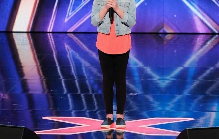 A quiet moment on a huge talent-show stage can feel louder than any song—especially when the performer is a young contestant standing alone under bright lights. With the glowing star backdrop behind her and the microphone held tight in both hands, she looks equal parts excited and terrified, the kind of nervous energy that makes the audience lean in closer.