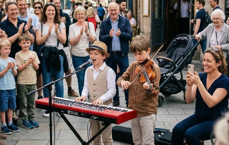 On a busy outdoor street, a small performance setup caught the attention of passersby. A keyboard, a microphone, and a violin hinted at a musical moment, but few expected anything beyond a simple children’s performance.
