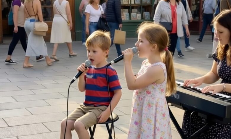 In a lively outdoor shopping area, two young siblings stepped up to a simple microphone and keyboard setup. Their casual appearance and calm presence made the moment feel modest as it began, without drawing much initial attention.
