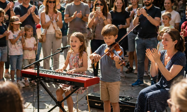 On a busy outdoor street, a small performance setup caught the attention of passersby. A keyboard, a microphone, and a violin hinted at a musical moment, but few expected anything beyond a simple children’s performance.