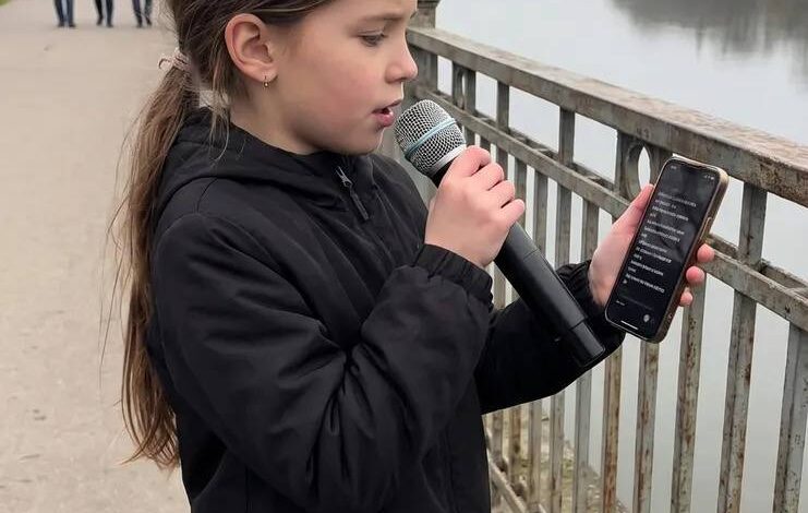 A young girl performing on a riverside walkway caught the attention of passersby during what initially seemed like a simple street performance. Holding her phone in one hand and a microphone in the other, she appeared focused and calm as she prepared to sing.